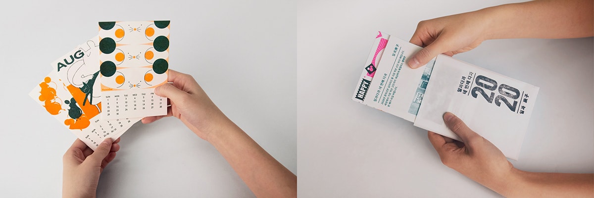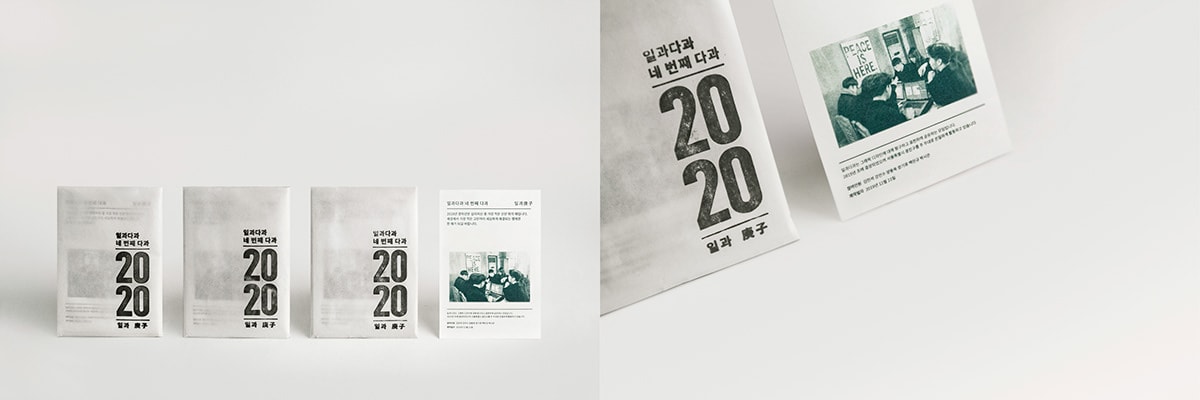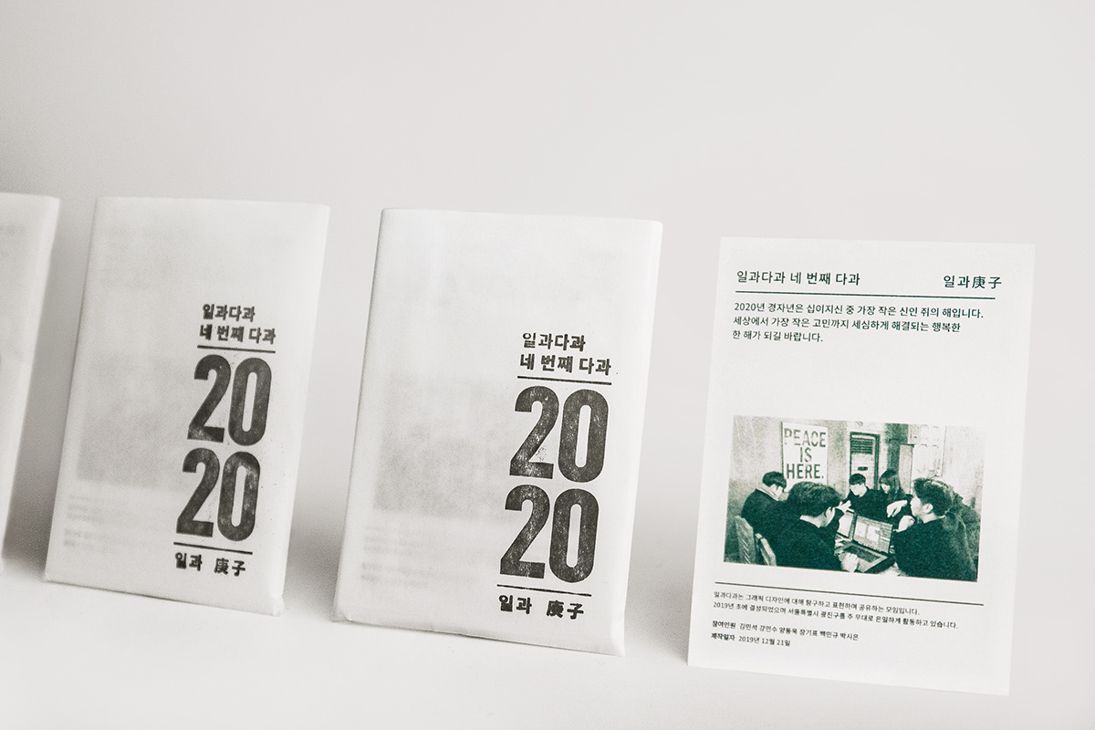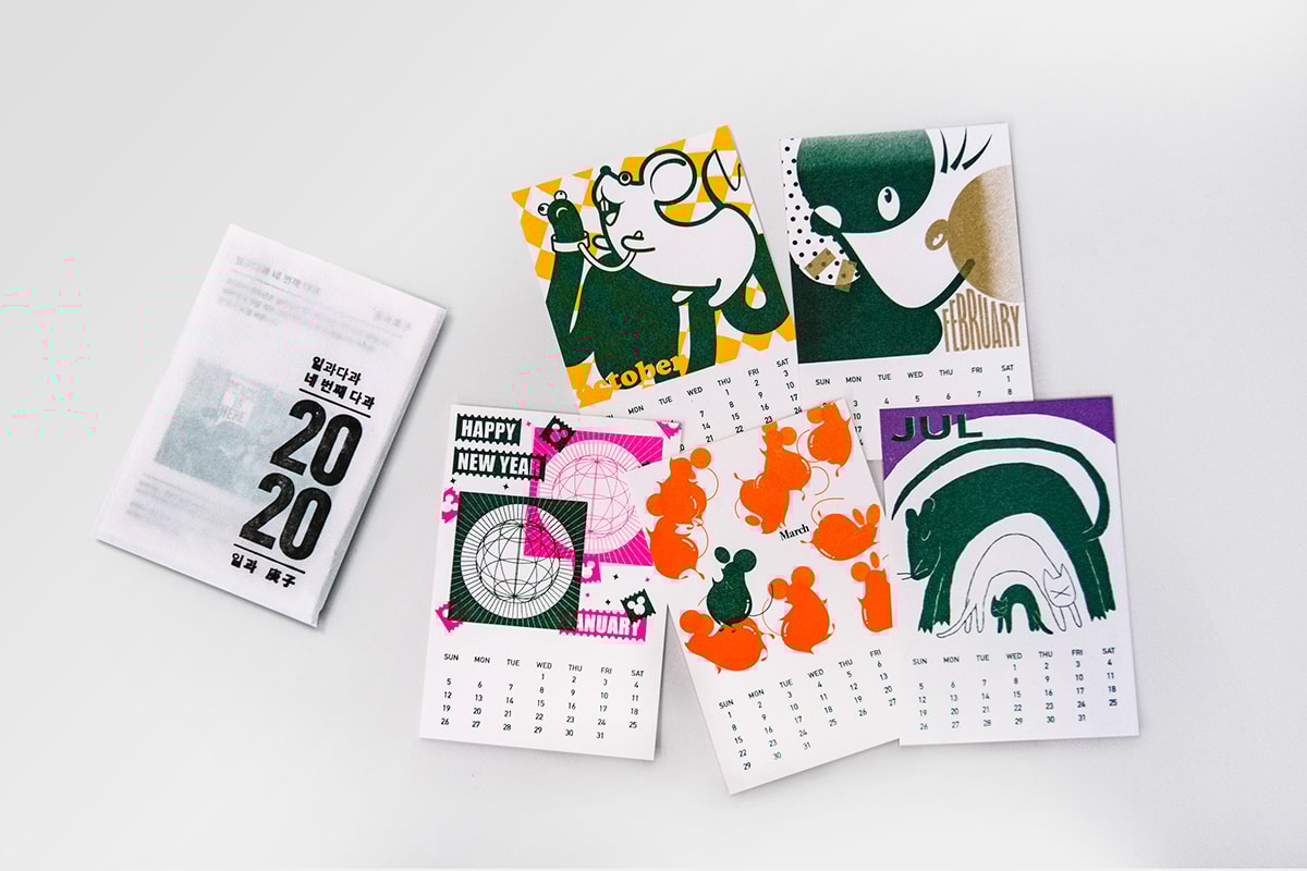 2020년을 기념하며 엽서형 달력을 제작했습니다. 2020년은 십이지신 중 가장 작은 신인 쥐의 해입니다. 세상에서 가장 작은 고민까지 세심하게 해결되는 행복한 한 해가 되길 바라는 마음을 담았습니다. 엽서는 리소 프린팅 기법을 사용했으며, 패키지는 스탬핑으로 디테일을 더했습니다.