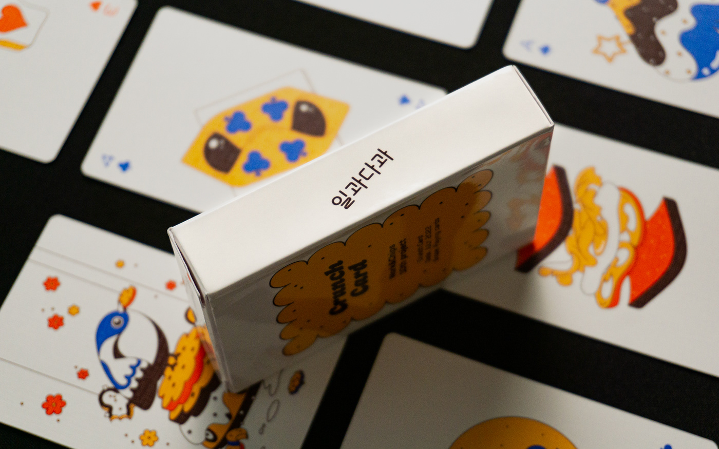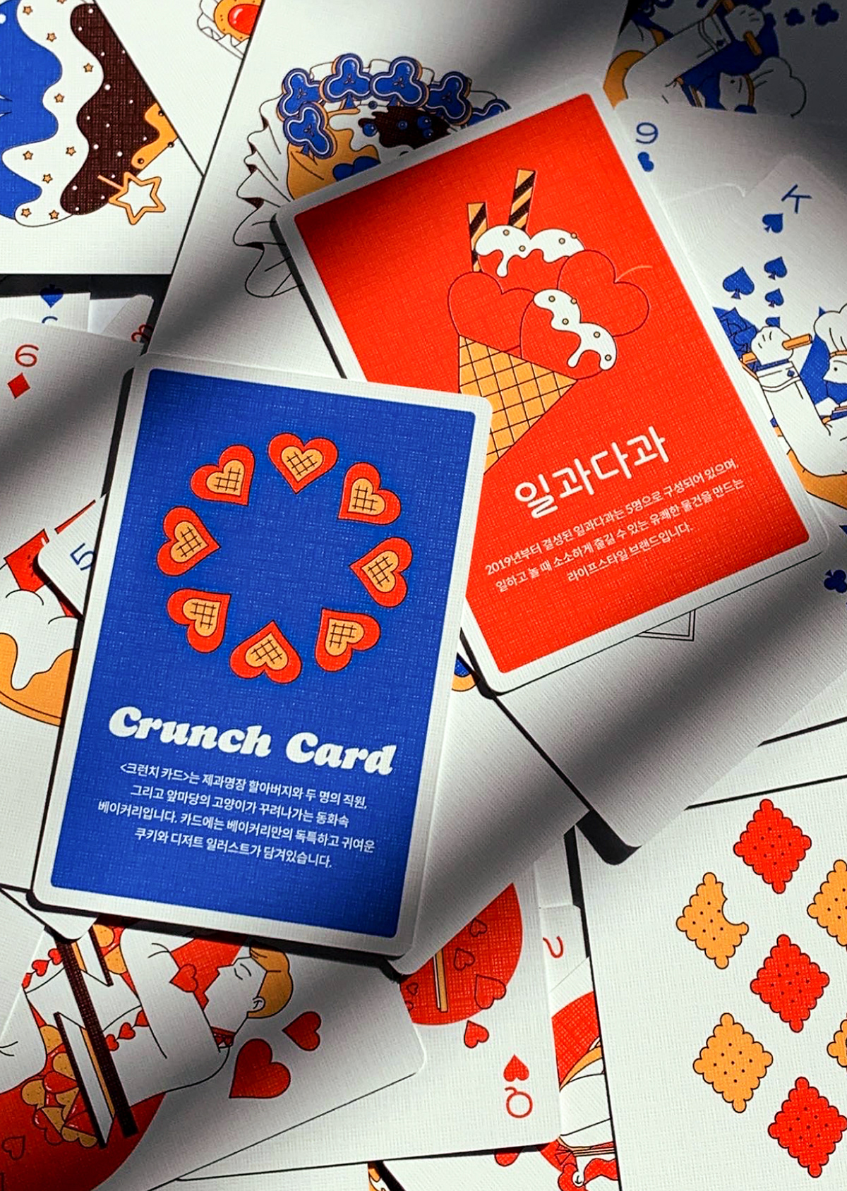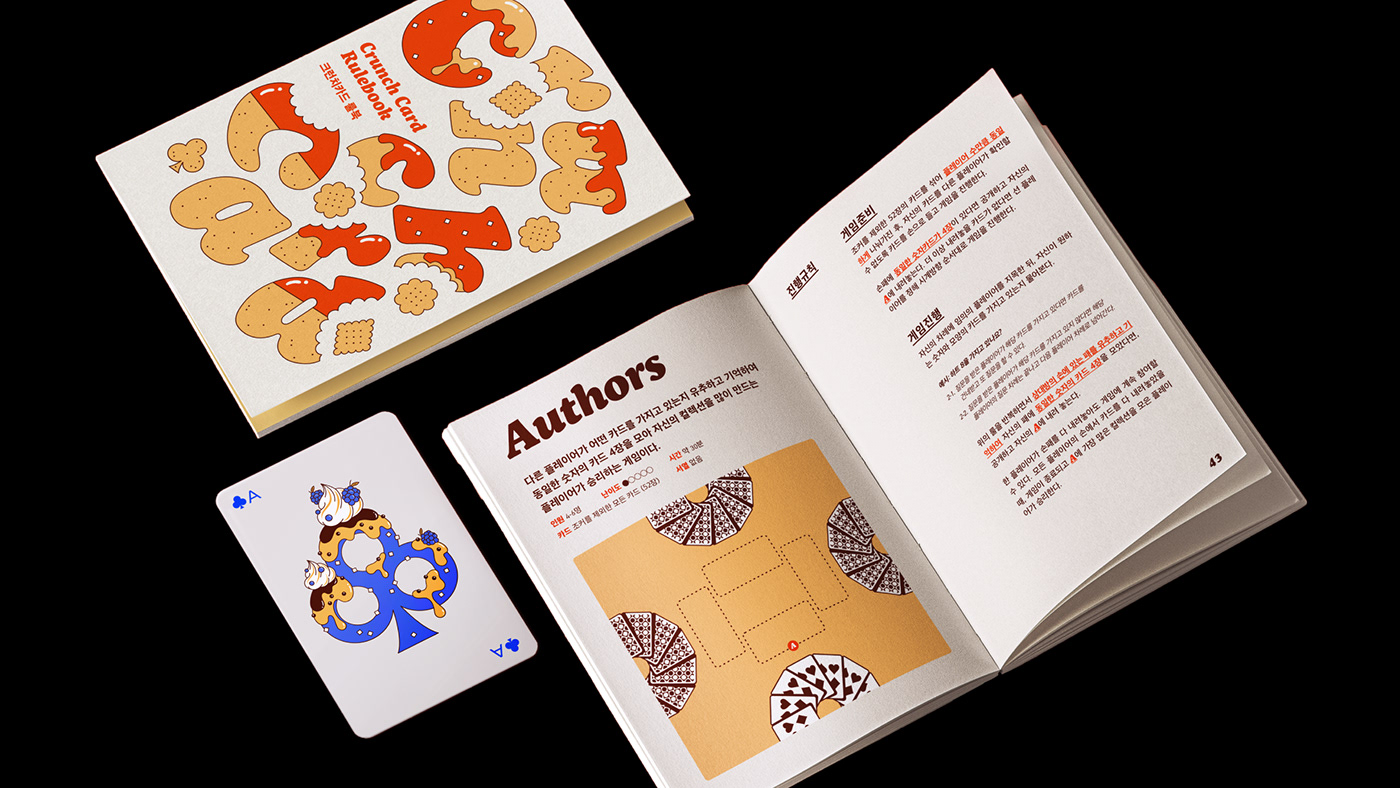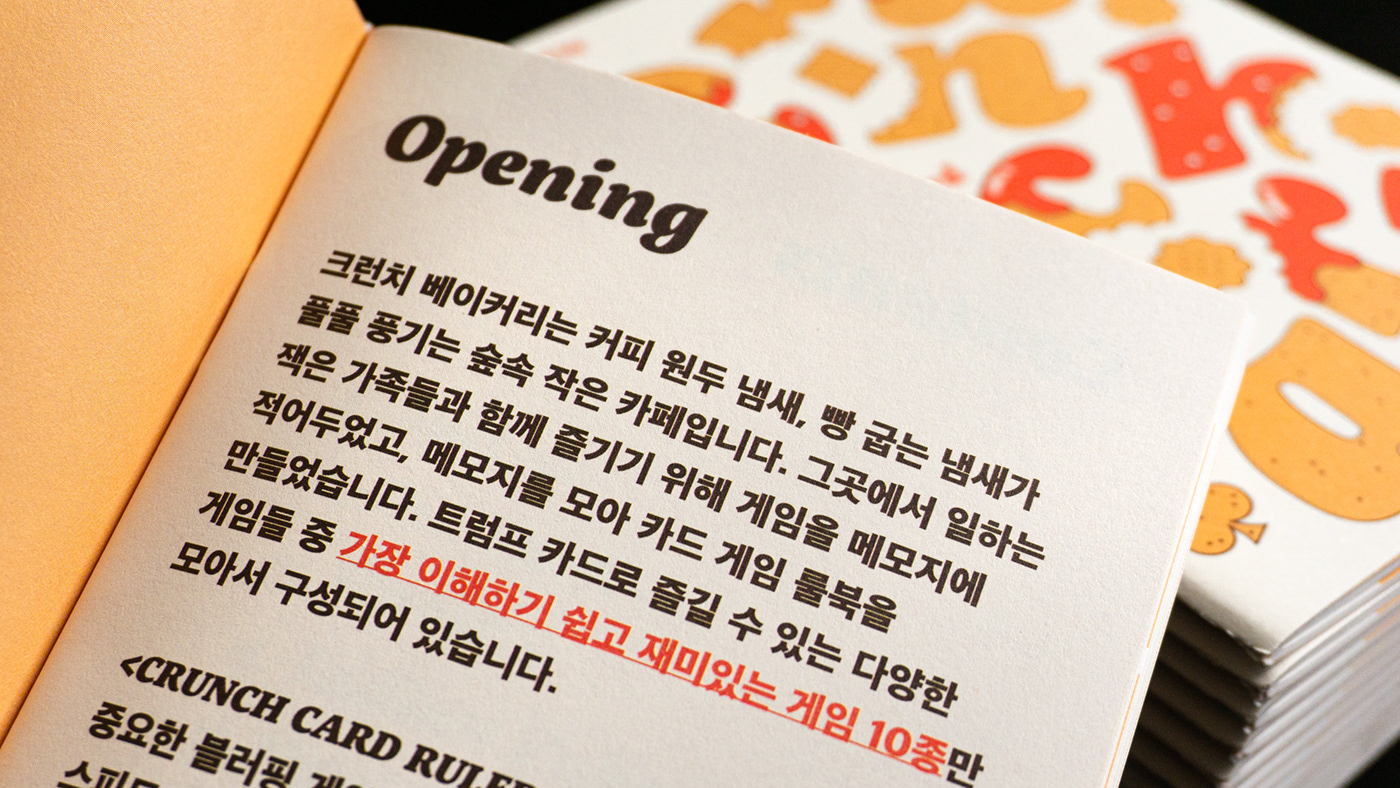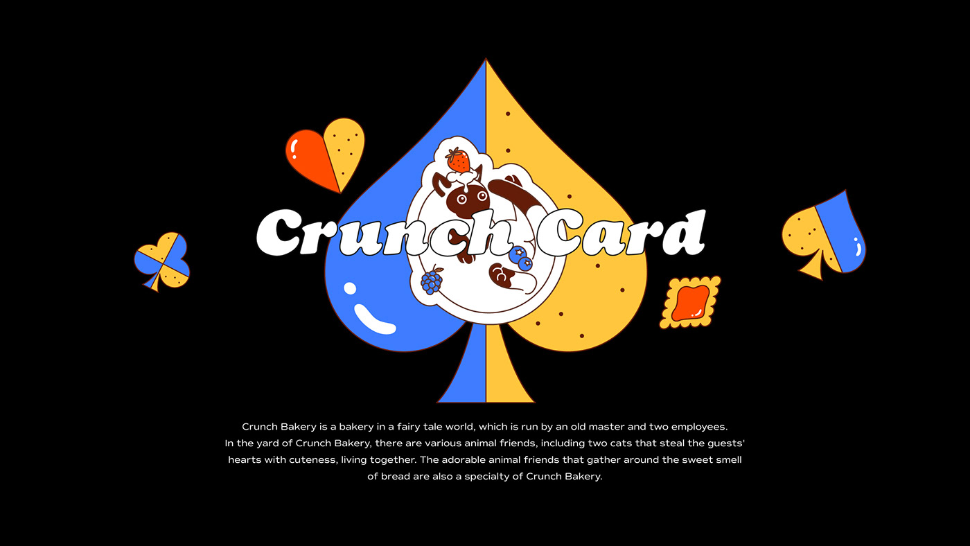 크런치 카드는 베이커리를 모티브로 기획 및 제작한 트럼프 카드 세트입니다. 기존 54장의 카드와 더불어 스페셜 티츄 카드 4장을 더해 트럼프 카드 컬렉터들의 니즈를 반영했습니다. 아기자기한 제과제빵 일러스트로 수집 가치를 높였습니다. 카드 외에도 10가지의 카드 게임을 소개하는 가이드북과 파우치, 스티커 등 다양한 구성으로 구매할 수 있습니다. 크라우드 펀딩을 통해 성공적으로 론칭했으며, 상상마당 홍대점 등 오프라인 판매도 진행했습니다.