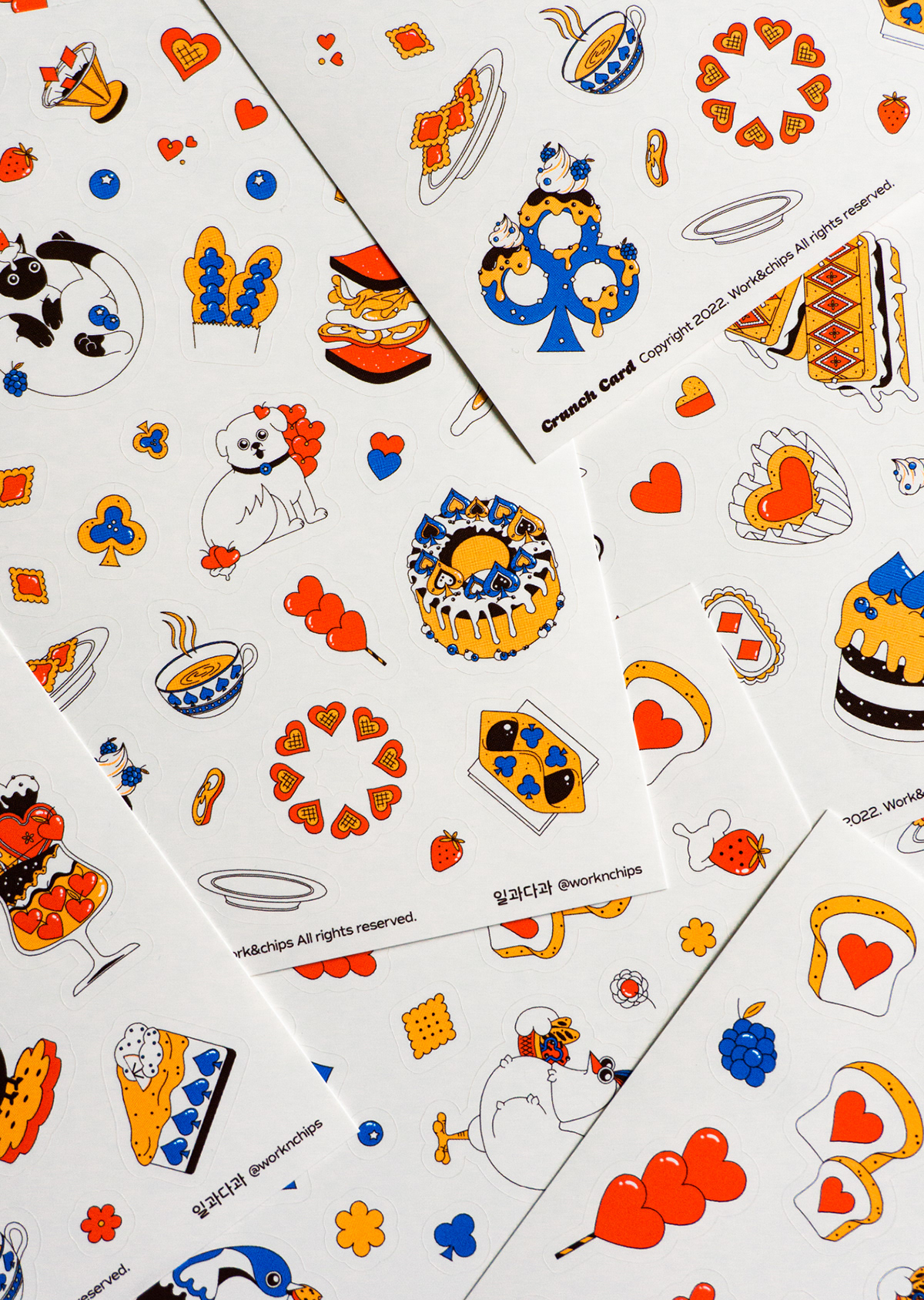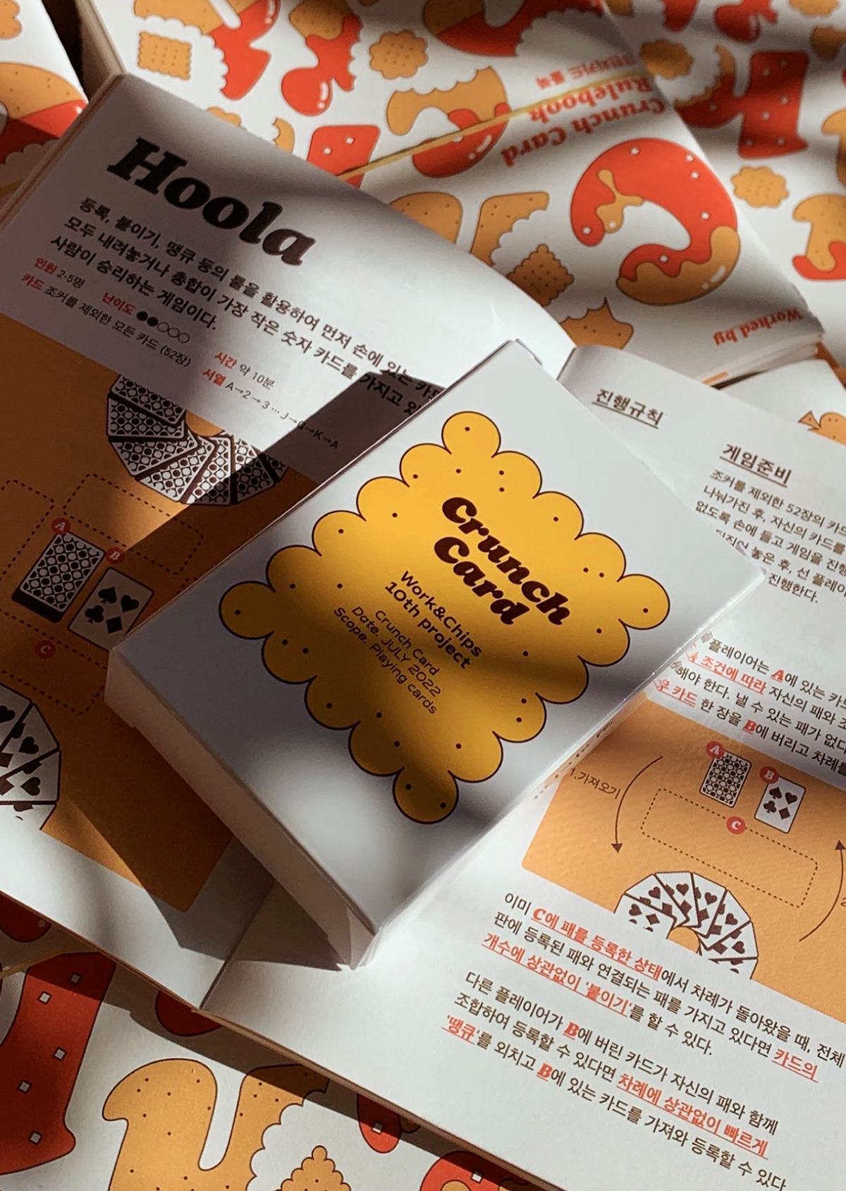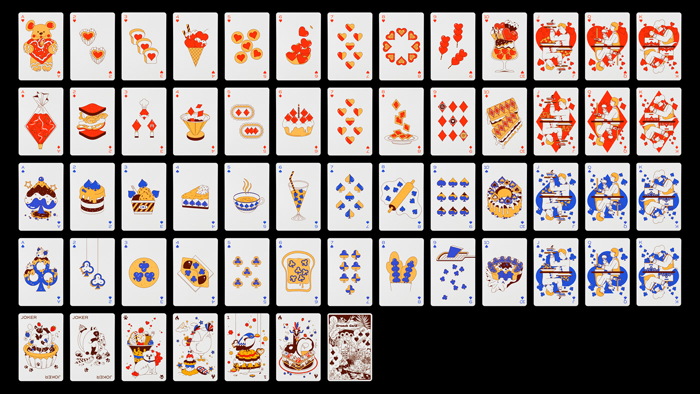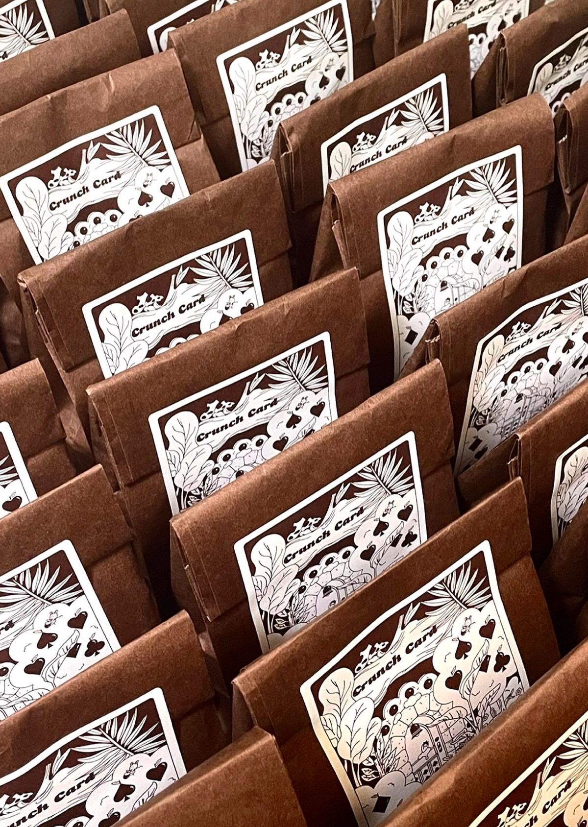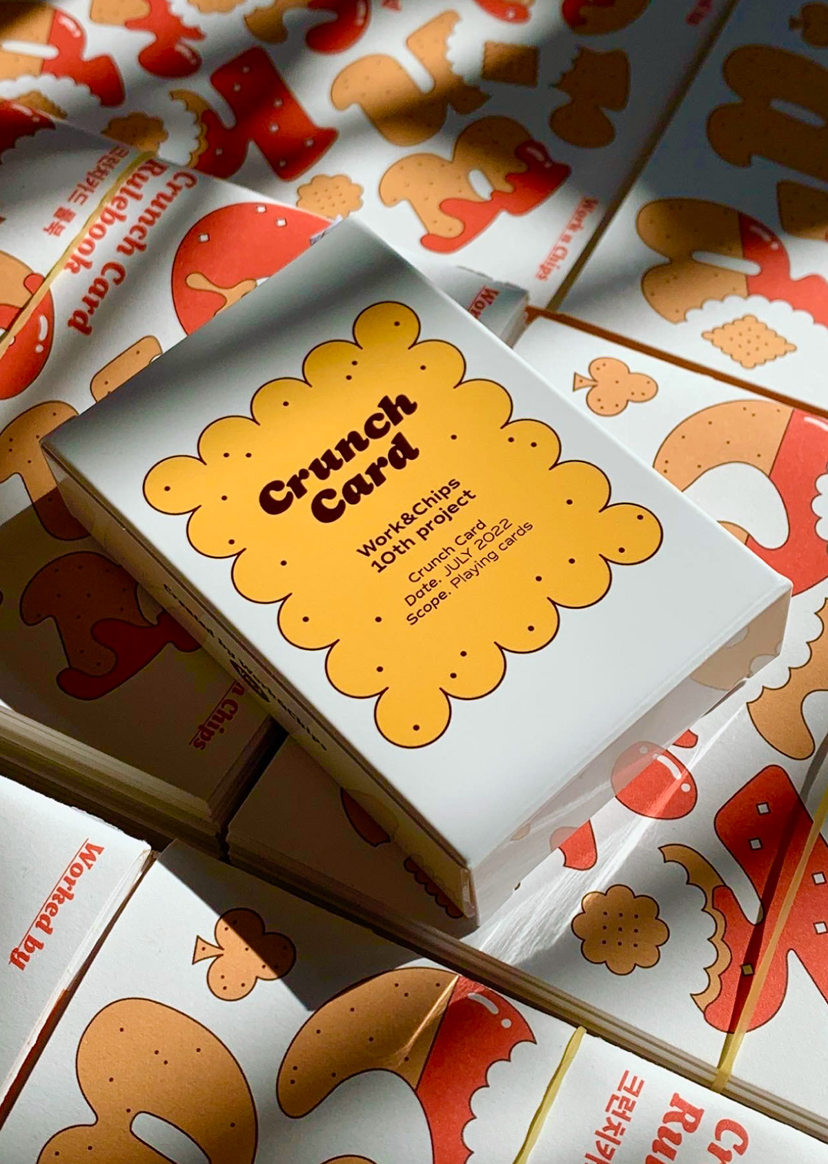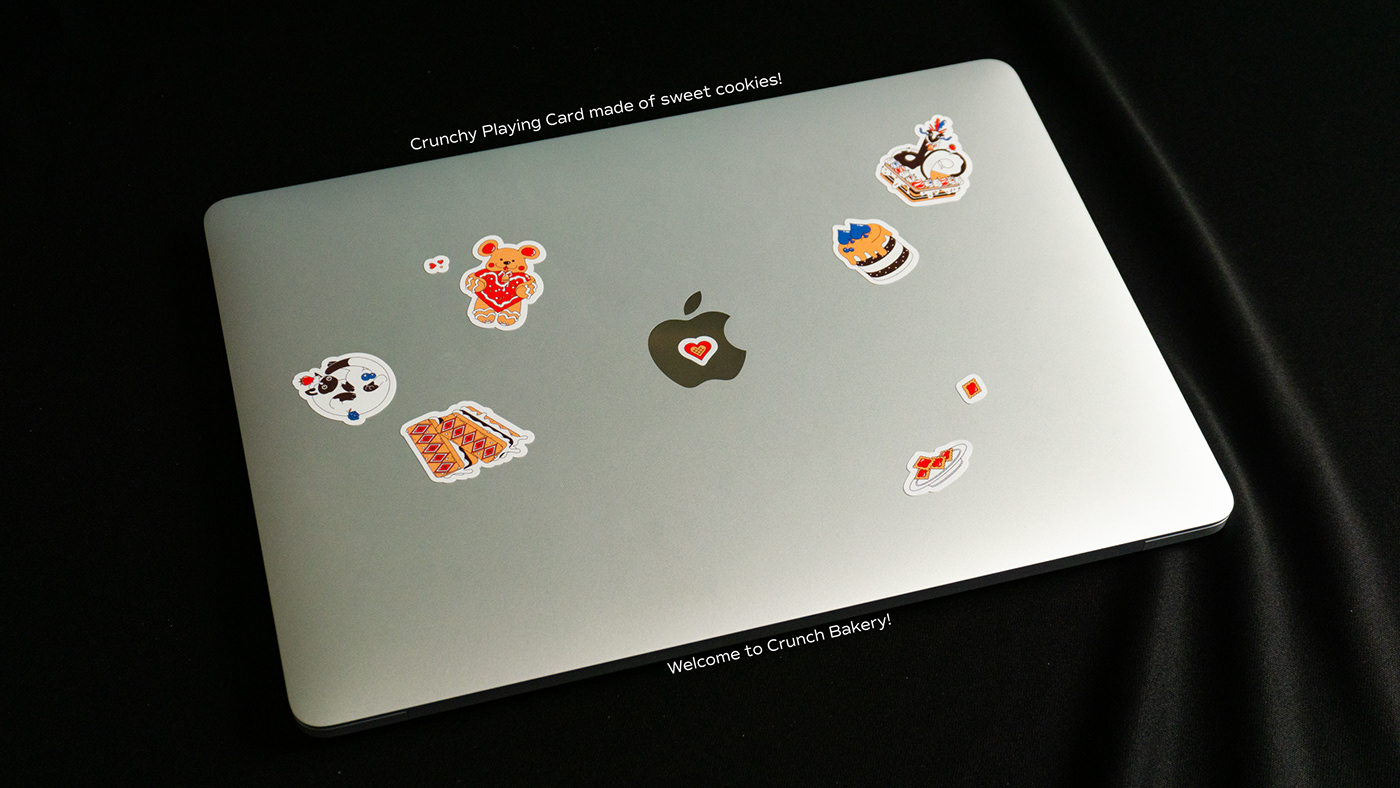 크런치 카드는 베이커리를 모티브로 기획 및 제작한 트럼프 카드 세트입니다. 기존 54장의 카드와 더불어 스페셜 티츄 카드 4장을 더해 트럼프 카드 컬렉터들의 니즈를 반영했습니다. 아기자기한 제과제빵 일러스트로 수집 가치를 높였습니다. 카드 외에도 10가지의 카드 게임을 소개하는 가이드북과 파우치, 스티커 등 다양한 구성으로 구매할 수 있습니다. 크라우드 펀딩을 통해 성공적으로 론칭했으며, 상상마당 홍대점 등 오프라인 판매도 진행했습니다.