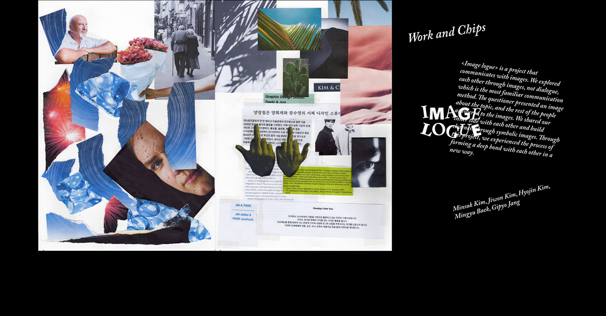 <IMAGELOGUE> is a project that communicates with images. We explored each other through images, not dialogue, which is the most familiar communication method. The questioner presented an image about the topic, and the rest of the people answered to the images. We shared our inner side with each other and build closeness through symbolic images. Through this project, we experienced the process of forming a deep bond with each other in a new way.