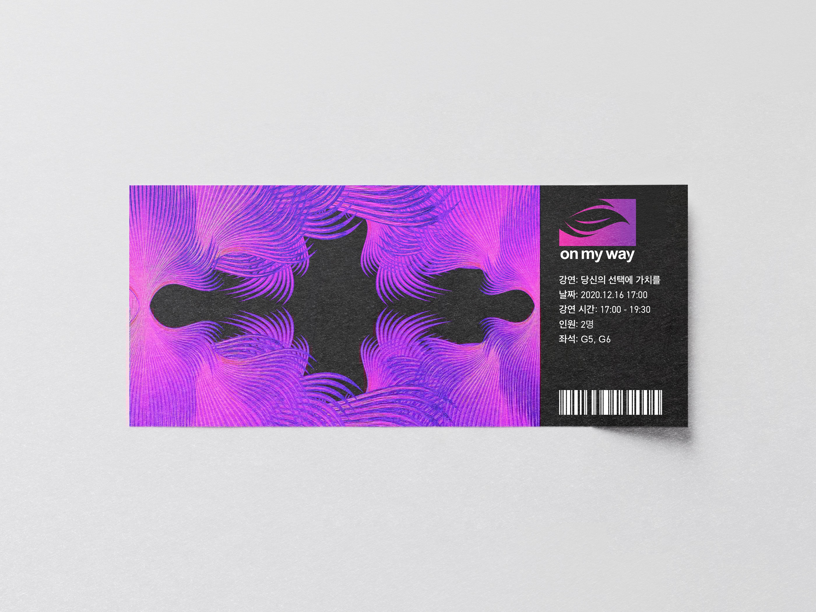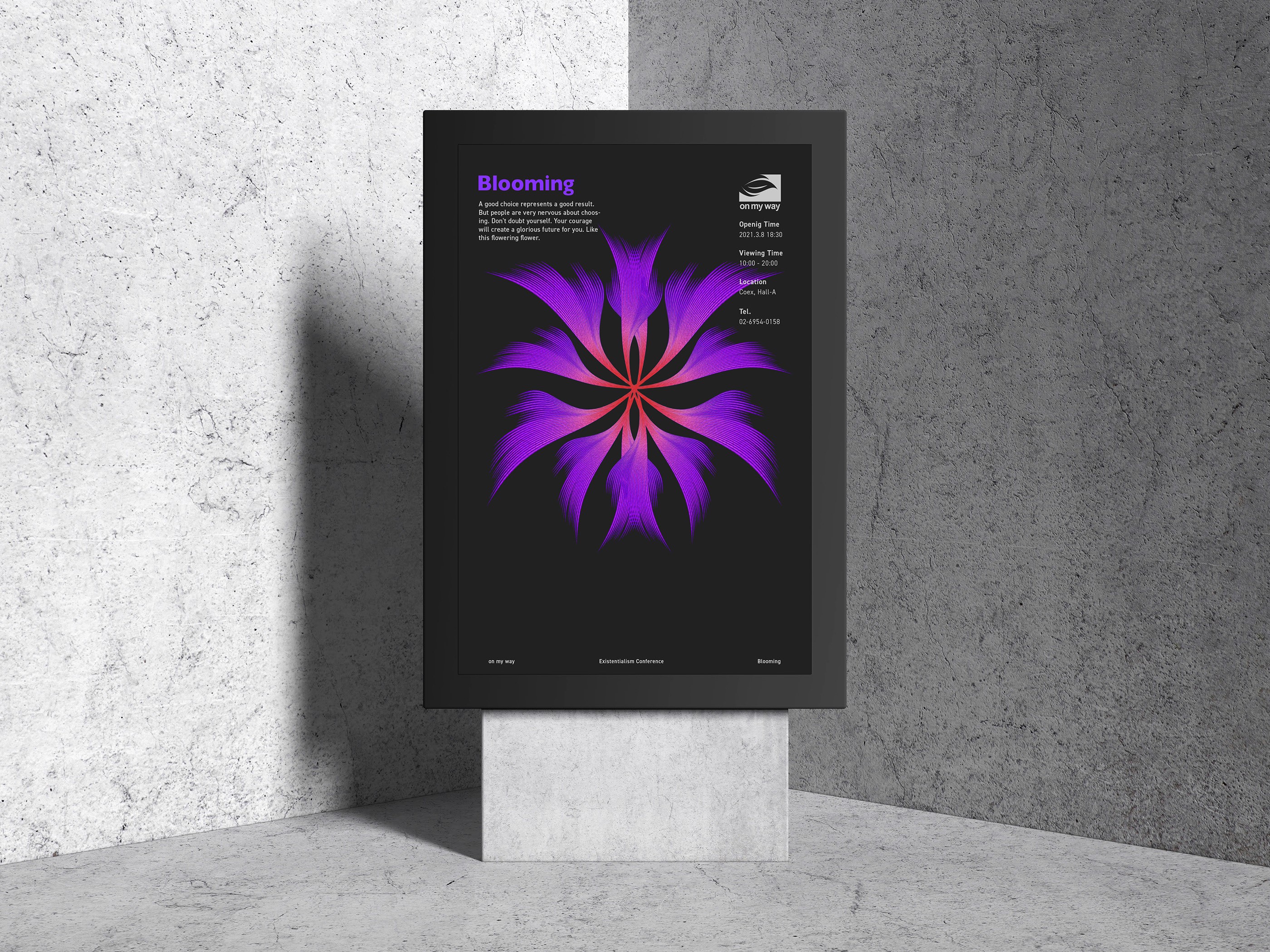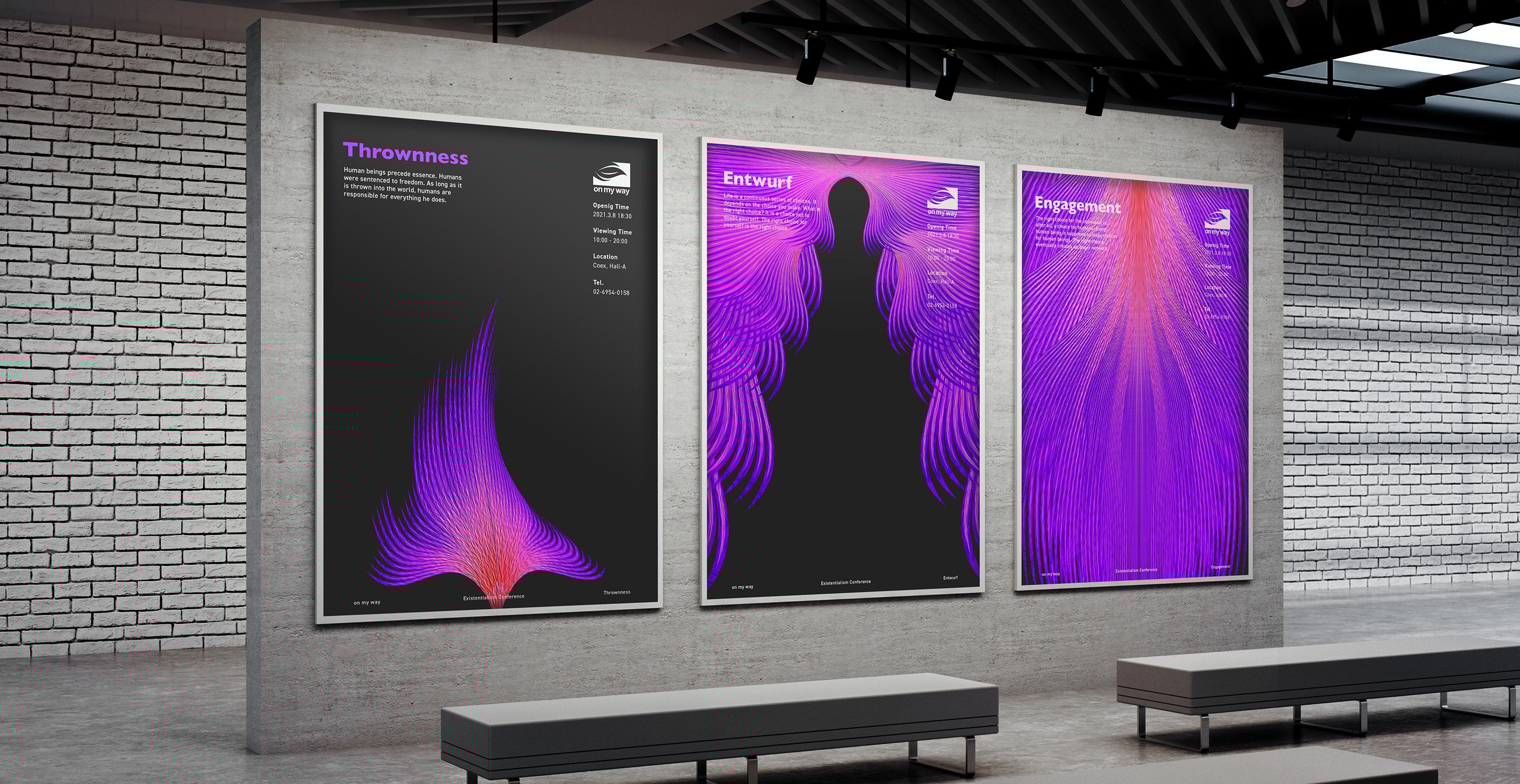 on my way 컨퍼런스는 현대인들의 불안을 해소시키기 위한 컨퍼런스입니다. 샤르트르의 실존주의 철학을 바탕으로 하고 있습니다. 그에 따르면 인간은 자유롭기에 불안하고, 자유의 책임을 두려워 합니다. 실존주의 철학을 3단계로 구성하여 시각화하고 해당 그래픽을 컨퍼런스 브랜딩에 녹여냈습니다. 1단계는 탄생, 2단계는 기투(수많은 선택), 3단계는 앙가주망(좋은 선택이 사회에 환원하는 광명)을 의미합니다. 해당 3단계는 위에 있는 포스터 3종으로 제작했습니다.